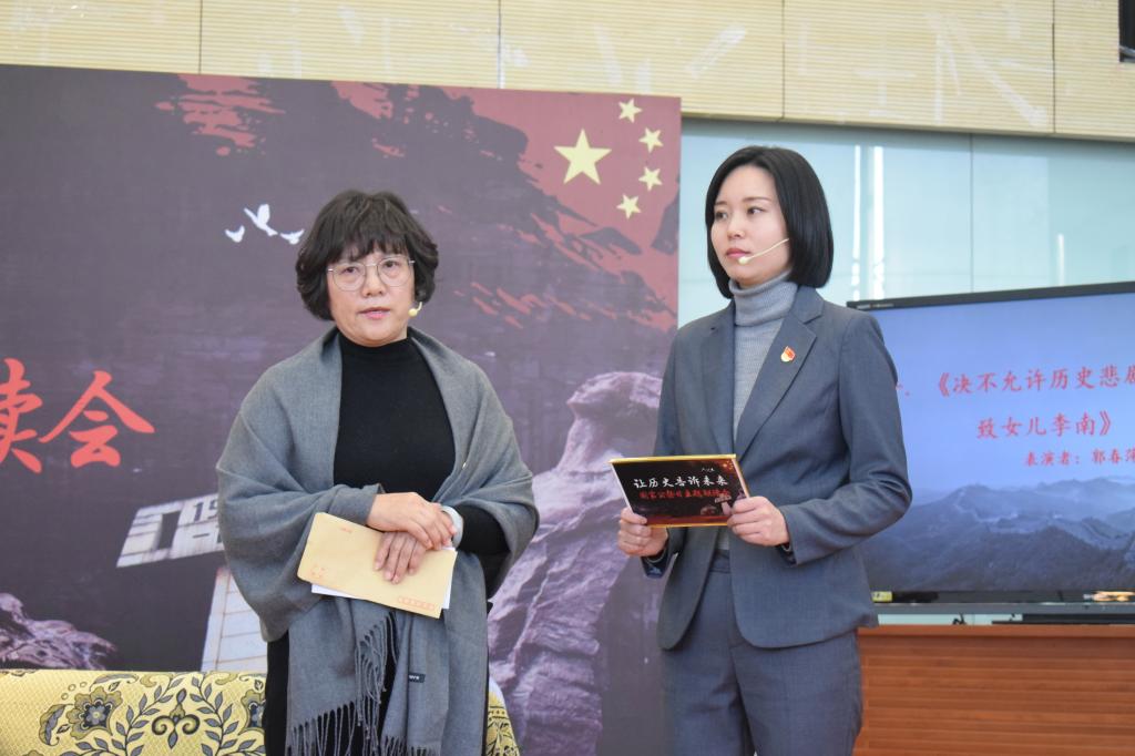 “由于常常受到惊吓,许多年后,凡听到沉重的皮靴声,奶奶仍会吓得发抖,可见所受精神创伤是何等的严重。”新闻学院郭春萍老师首先朗读了南京大屠杀幸存者李道煃老先生致女儿李南的一封家书为大家打开了尘封的历史。接着,八位同学倾情演绎的群诵《狂雪》,描绘出南京大屠杀中残酷血腥的场面,屈辱与痛苦涌上每一位观众的心头。李博伟老师结合参观拉贝故居的经历,与大家分享了《拉贝日记》的片段,通过一个外籍人士的视角,控诉了南京大屠杀中日本军队的种种罪行。