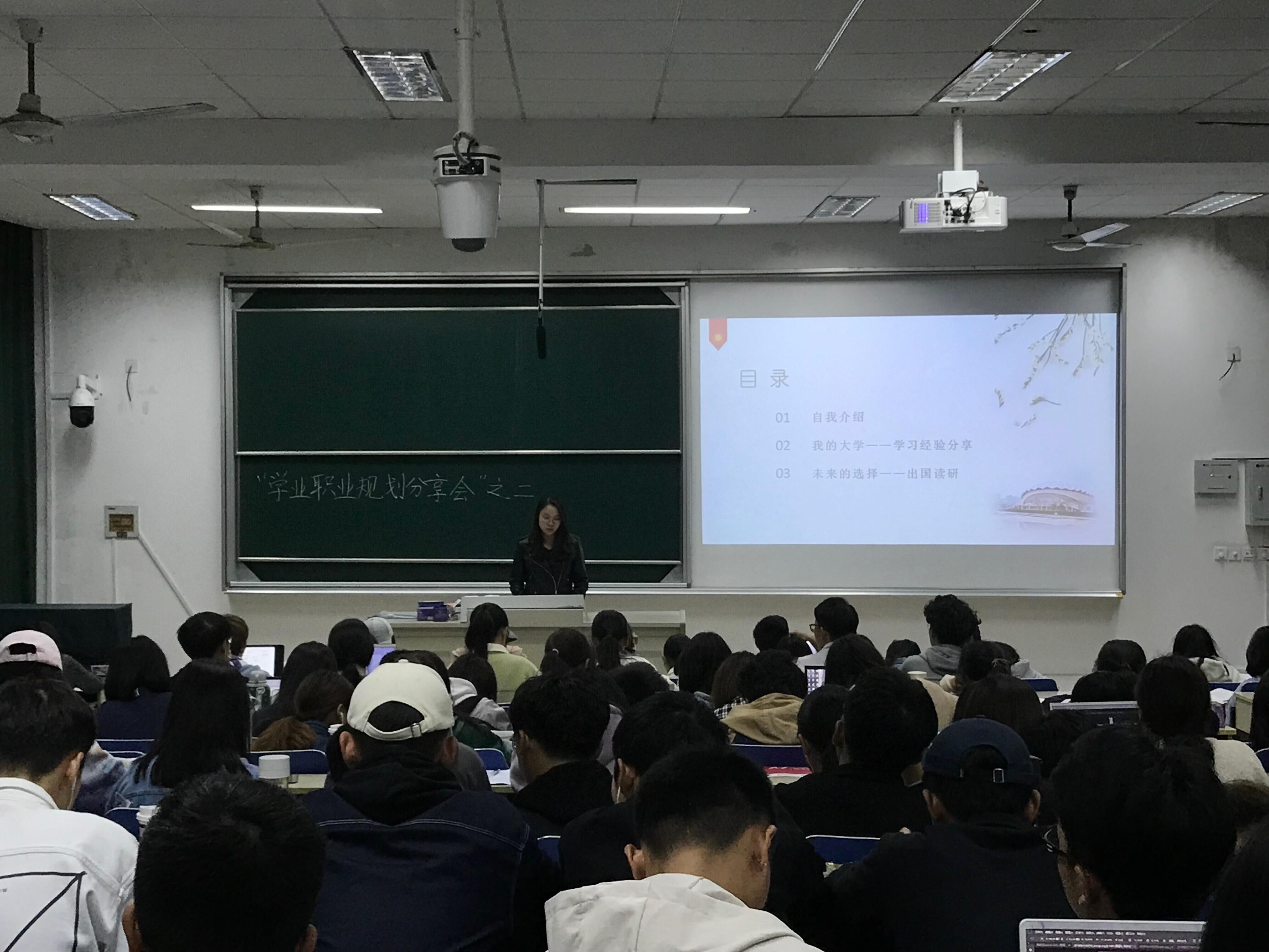 施雨宁同学学习成绩优异,目前在全年级学生中学习绩点排名第一,她认为要将课堂学习和自主学习有机结合,课堂学习侧重掌握基础知识,激发研究兴趣,而自主学习可以从实际操作能力和语言能力方面提升。施雨宁同学提到自己毕业后的选择是出国继续深造,她向大家介绍了选择出国的思考和申请的相关常识。支婷婷同学作为现任院学生会主席,在社团工作方面表现突出。她与同学们分享了自己参加的社团组织工作经验,并且对同学们的一些困惑进行了解答。她认为社团和学习要同时兼顾,在社团工作视野要放开阔些,但也要避免把社团看得太重的现象出现。最后,她希望大家能在社团中脚踏实地,多方面提升自己的综合能力。